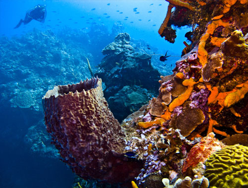 This is a beautiful wall dive. The coral formations are extremely healthy. You will see towers of coral built on the skeletons of ancient coral that has built up over millions of years. Giant Barrel Sponges, as well as Deepwater Fans and Black Coral form a nice backdrop for photography.