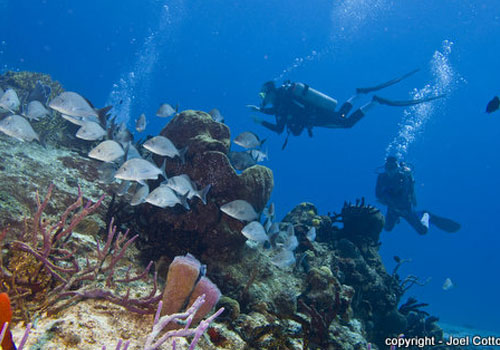 You can see Turtles, Honeycombed Cowfish, and Parrotfish in the open. Near and under the coral heads look for lobster, juvenile tangs and Angelfish, and the occasional Splendid Toadfish. You'll see some lion fish also. In the sand, you will find sting rays, peacock flounder, urchins, and possibly a sea horse.
