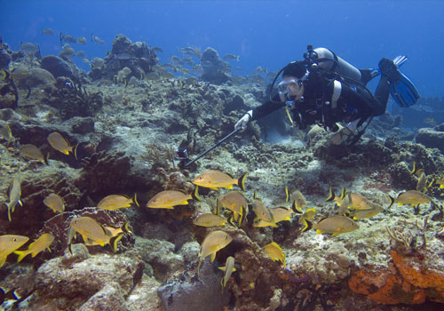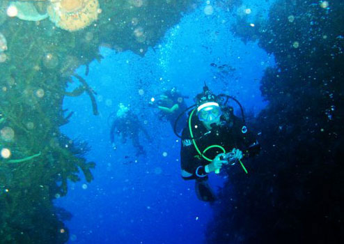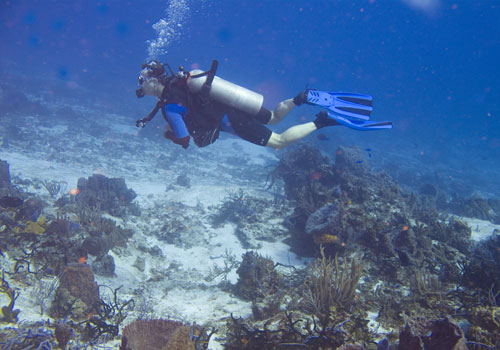 Maracaibo is an extremely impressive wall dive. This is the southernmost reef, very close to the Punta Celerain Lighthouse. There are usually large ocean swells when entering the water. The edge of the wall is about 90' down....descend slowly and keep your bearings. Once to the edge, look over, and you can see a sheer cliff overhand that plummets to the deep blue. Some divemasters will continue on down, as there are some beautiful formations at about 150'. However, most divemasters will take you along the edge of the wall. As you approach the arch, you will see a deep fissure that cuts across the lip of the wall. You will enter this fissure and descend about 30' and come out on the face of the wall and swim north. Looking at the face of the wall you will see one of the most dramatic formations in the area...a large perfectly shaped arch that is about 30' across. You will enter the arch from the bottom and swim up through it, following the fissure that created the arch.Most divemasters will then take you towards the shore and you will come to the Chun-Chacaab reef.