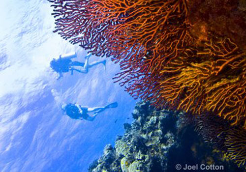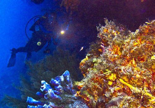 Although this is classified as a deep dive, the dive is usually done as a multi level drift dive and ends about 25' deep on the top of the reef. The reef slopes outward to the reef edge and deeply convoluted lip. The corals form tall towers, spires and buttresses, caves, gullies and canyons. Deep fissures run under the corals and sand slopes plummet into the depths. There are countless caves and canyons along this stretch of reef and you will never be able to see all of them even after several dives. This reef is not rich with fish by Cozumel standards. The coral and sponges are the big show here.