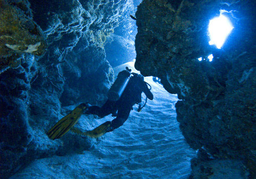 On the top edge of the wall towards shore are sandy bottom areas and with nice big overhangs to hide out from the current. The coral is rocky with large rocky outcrops that are 30-40' tall. The wall drops steeply, but there are ledges and some sandy areas on the way down. There are beautiful swim throughs that take you from the wall back to the sandy area, and vice versa. Look for French Grunts and Schoomasters in the darker areas.